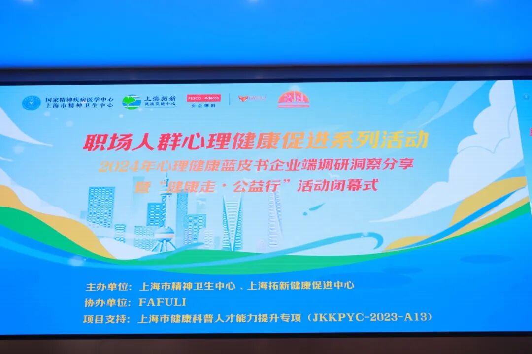 2024年12月27日,上海市精神卫生中心携手外企德科FAFULI、上海拓新健康促进中心、上海浦东总部经济共享服务中心(平台)等单位协办的2024 年心理健康蓝皮书企业端调研洞察分享暨“健康走•公益行”活动闭幕式在上海市精神卫生中心举行。本次活动有50多家单位,近200名职场人士参与。