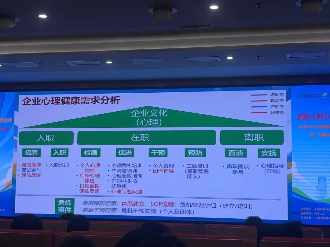 FAFULI建议:职场心理健康问题普遍,企业应将其纳入文化建设与战略,加强软硬件、培训与能力建设,在员工入职、在职、离职以及突发事件四个环节做好管理和职场心理健康促进。